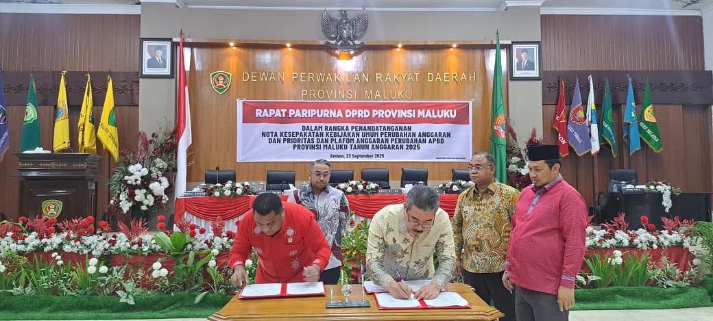 SUARAREFORMASI.COM.AMBON - Paripurna DPRD Maluku kembali mencatat sejarah penting dalam perjalanan tata kelola keuangan daerah. Selasa malam (23/9/2025), Gubernur Hendrik Lewerissa bersama Ketua DPRD Benhur Watubun resmi menandatangani nota kesepakatan Kebijakan Umum Perubahan Anggaran (KUPA) dan Prioritas Platform Anggaran Perubahan (PPAP) APBD Provinsi Maluku Tahun Anggaran 2025.Penandatanganan ...