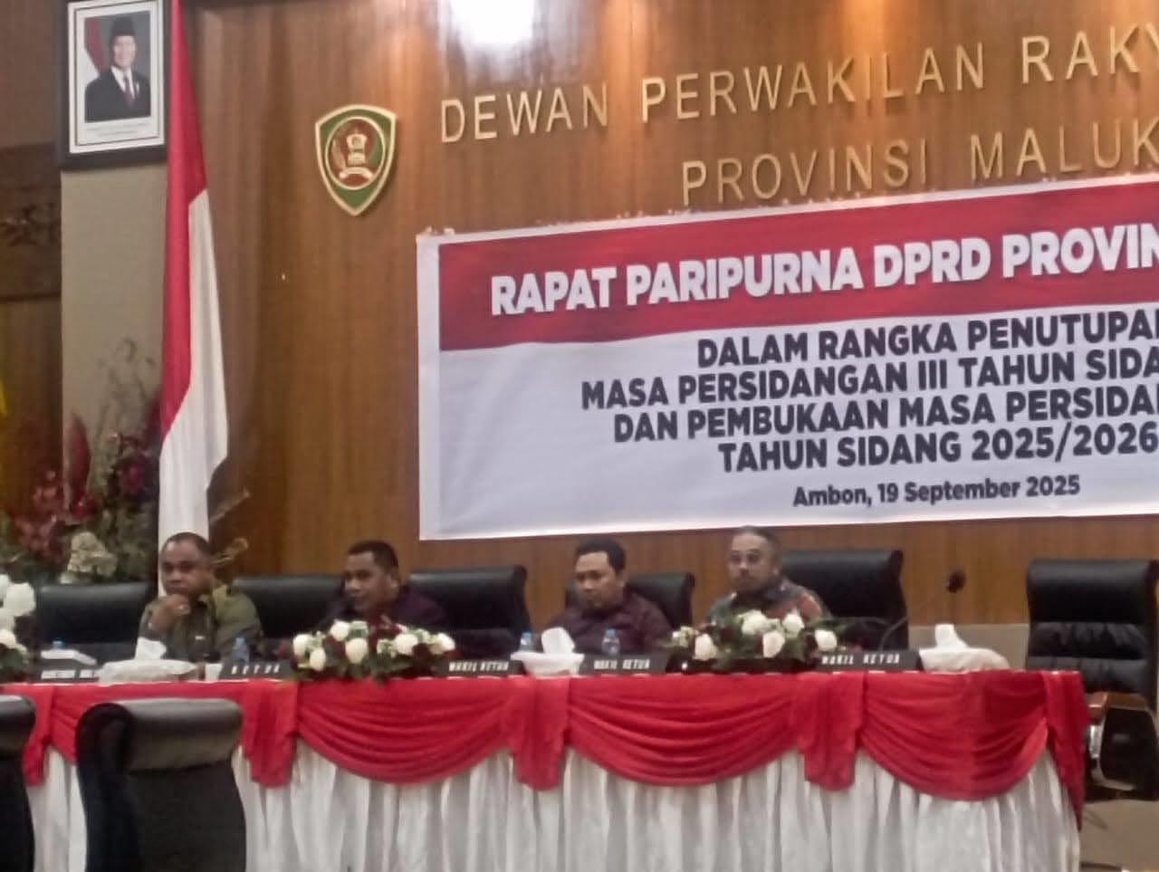 SUARAREFORMASI.COM.AMBON - Ketua Dewan Perwakilan Rakyat Daerah (DPRD) Provinsi Maluku Benhur G Watubun secara resmi membuka Rapat Paripurna DPRD Provinsi Maluku Dalam Rangka Penutupan Masa Sidang III Tahun 2025 dan Pembukaan Masa Sidang I Tahun Sidang 2025/2025 yang berlangsung di ruang Paripurna DPRD Provinsi Maluku Jumat (19/9/2025).Menurut Watubun, Berdasarkan pasal 169 ayat 2 huruf c peratura...